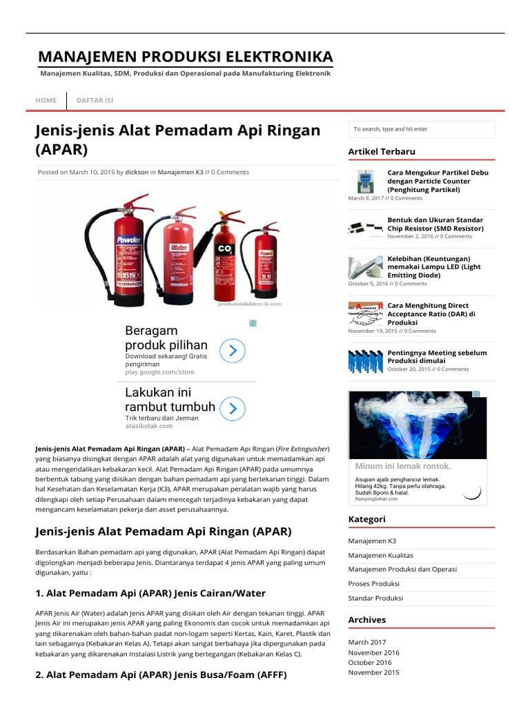 � pilih alat pemadam api yang sesuai, pastikan ke mana arah angin dan ikut arah angin semasa menggunakannya dan praktikkan kaedah pass. Alat pemadam api (apar) jenis busa/foam (afff). Untuk apar sendiri terdiri dari beberapa media isian. Apar merupakan sebuah alat yang digunakan hanya dalam keadaan darurat. Amat sesuai digunakan bagi kebakaran yang melibatkan perkakasan elektrik. Dikarenakan jenis pemadam api ini memiliki sifat bebas kandungan halon dan cfc. Alat pemadam api jenis co2 ditandakan dengan tulisan putih berlatarbelakang hitam 'carbon dioxide'. Jika kebakaran melibatkan bahan cecair ataupun gas yang mudah terbakar seperti minyak, cat, vanish, gas asli dan gas asetilina maka alat pemadam api jenis buih perlu digunakan. Alat pemadam api jenis air (water) kandungan: Apar (alat pemadam api ringan) gas liquid non cfc. 60 hingga 120 saat label atau warna: Jenis alat pemadam api mungkin masih banyak orang yang belum memahami alat pemadam api yang mereka miliki, baik dari jenis dan sistem kerjanya seperti apa. Kebakaran kelas b merupakan jenis peristiwa kebakaran yang terjadi karena bahan cair yang mudah terbakar.